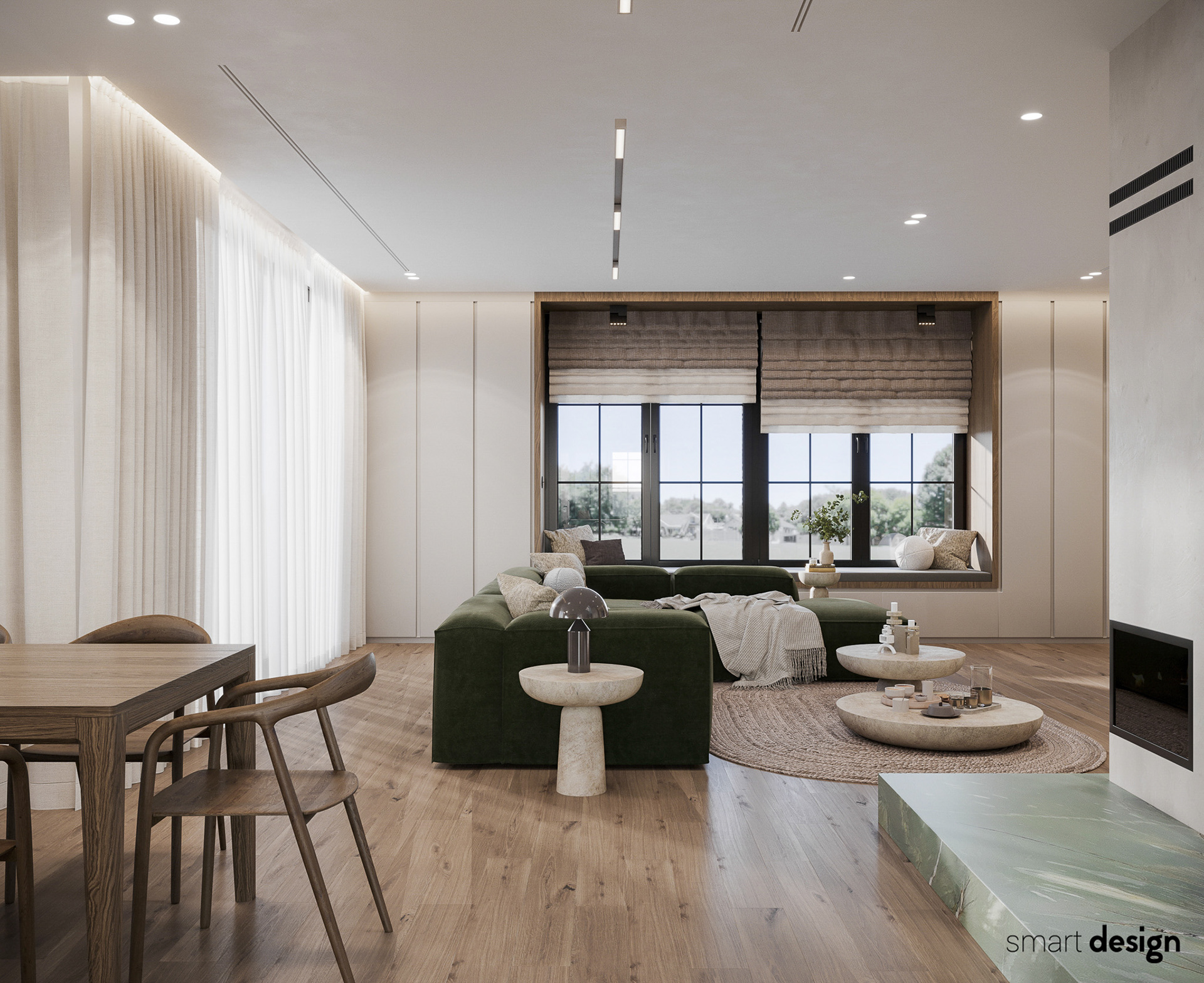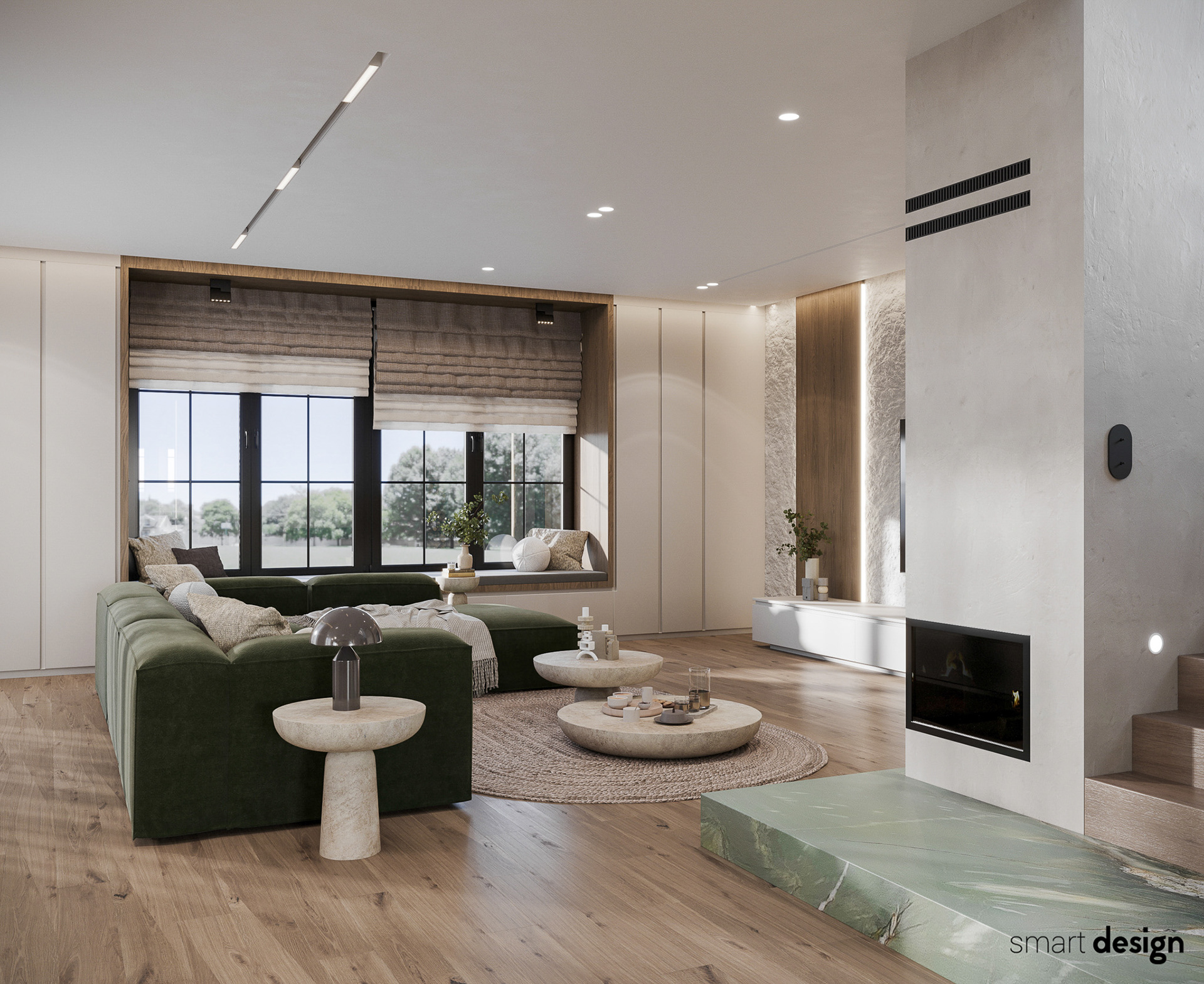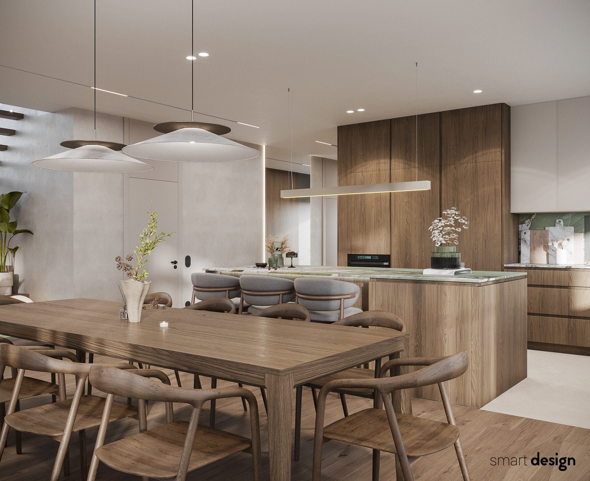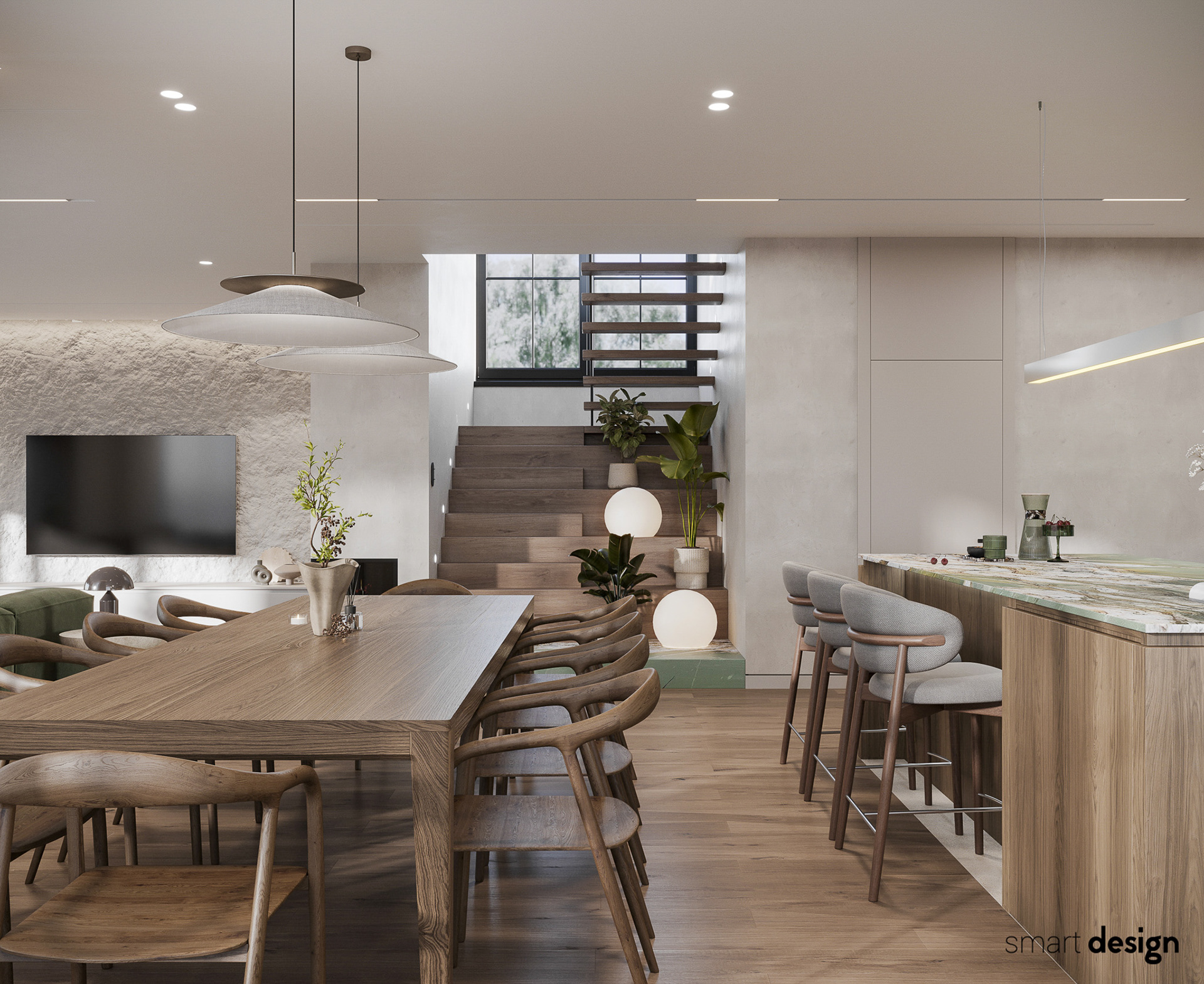 Dom w stylu japandi Projekt wnętrz domu utrzymany w stylistyce japandi, łączącej japoński minimalizm z nordycką przytulnością. Naturalne drewno, stonowana paleta barw i proste formy tworzą spójną, spokojną przestrzeń sprzyjającą codziennemu komfortowi. Całość została zaprojektowana z myślą o funkcjonalności, harmonii i ponadczasowej estetyce.
