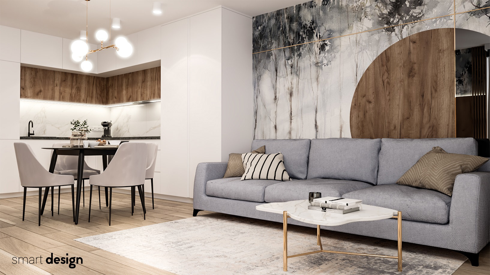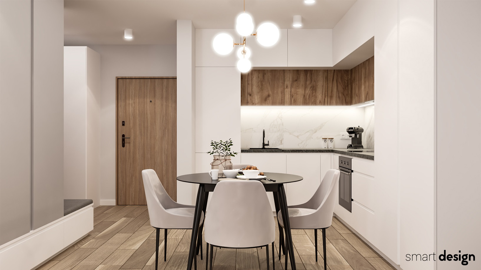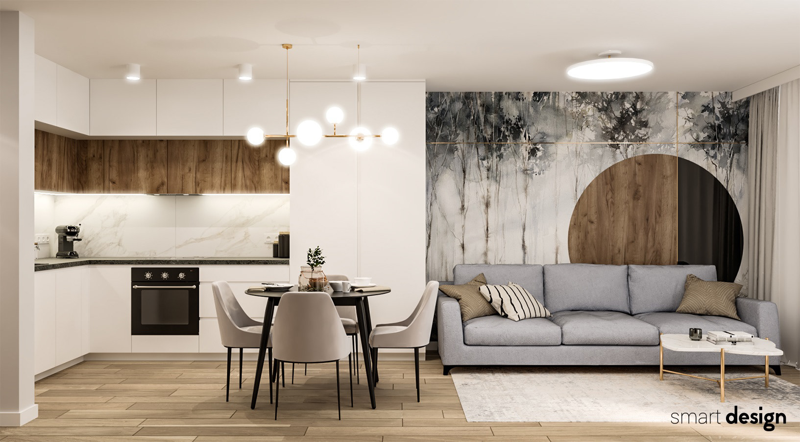 Strefa dzienna - Salon z aneksem kuchennym mieszkania w Krakowie.
