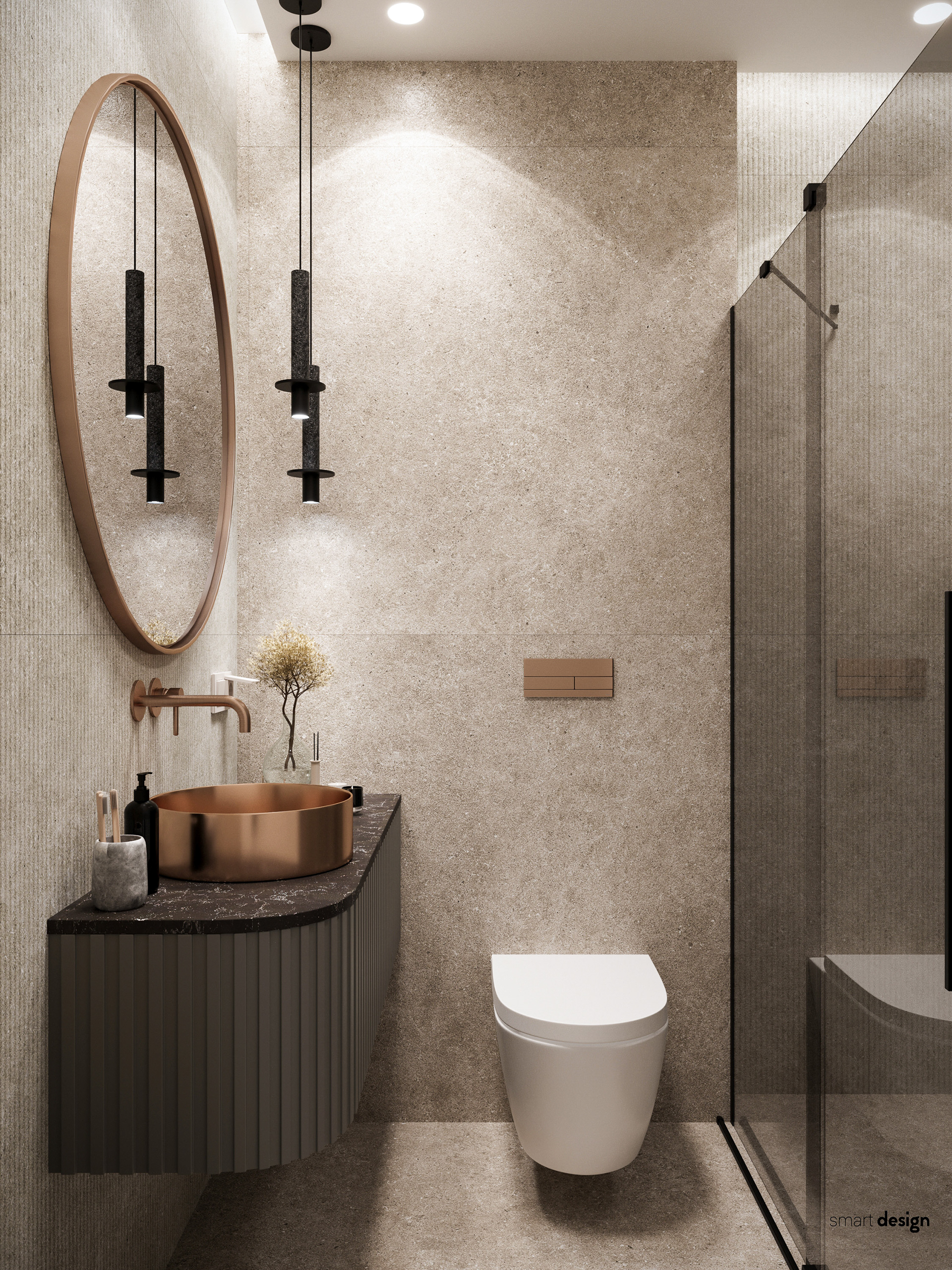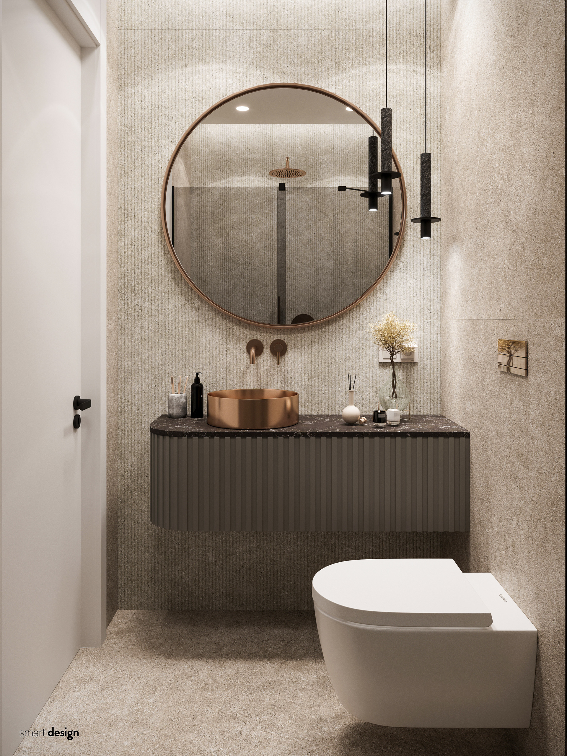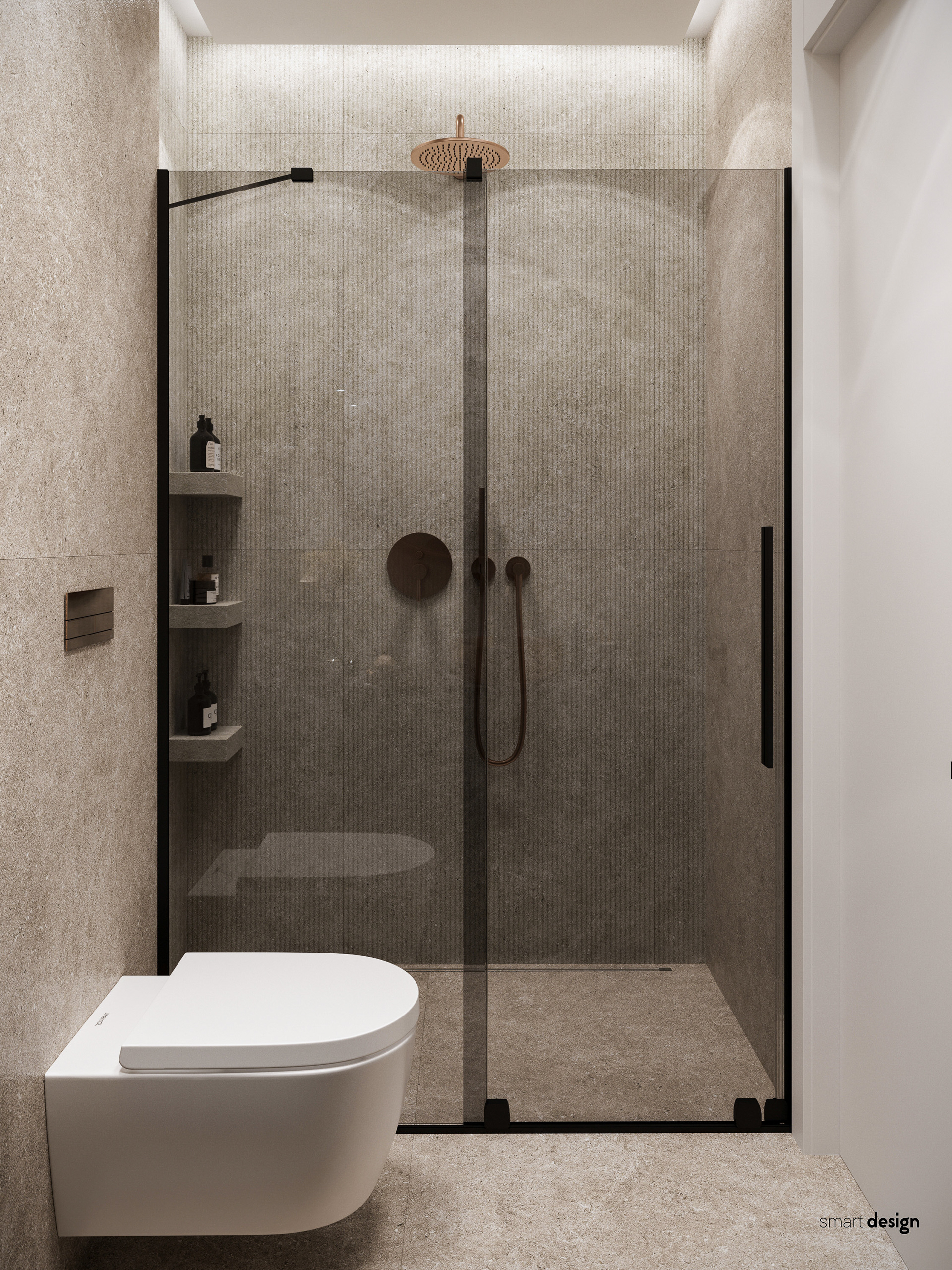 Łazienka | Dom jednorodzinny typu stodoła Minimalistyczna łazienka utrzymana w stonowanej, naturalnej kolorystyce. Połączenie kamiennych powierzchni, ryflowanej zabudowy oraz detali w ciepłym odcieniu mosiądzu nadaje wnętrzu spokojny, ponadczasowy charakter. Proste formy, transparentna strefa prysznica i subtelne oświetlenie tworzą funkcjonalną, estetyczną przestrzeń sprzyjającą codziennemu komfortowi.